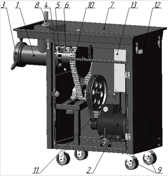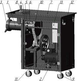 Мясорубка состоит из собственно мясорубки, чаши с предохранителем, толкача, корпуса в составе: электродвигатель, опоры, цепная и ременная передача, облицовка, блок управления. Собственно мясорубка в сборе состоит из: гайки, решетки №1, ножа, горловины из нержавеющей стали, в которой вращается шнек.