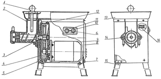 | МИМ-300.01.000 | Собственно мясорубка в составе: корпус мясорубки, шнек, гайка зажимная, нож двусторонний (2 шт.), нож подрезной, решетка №2, решетка №3, кольцо упорное, втулка | 1 | |